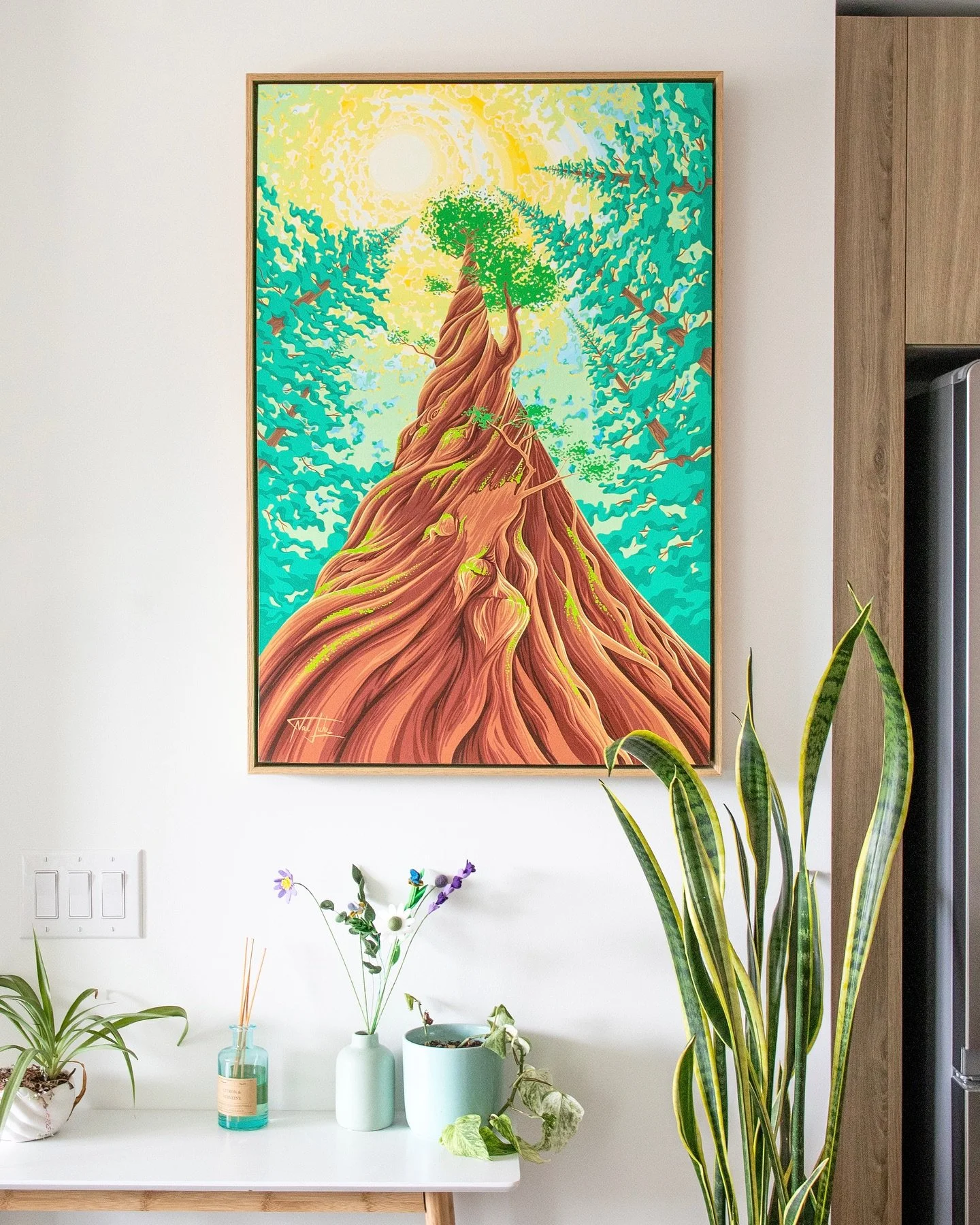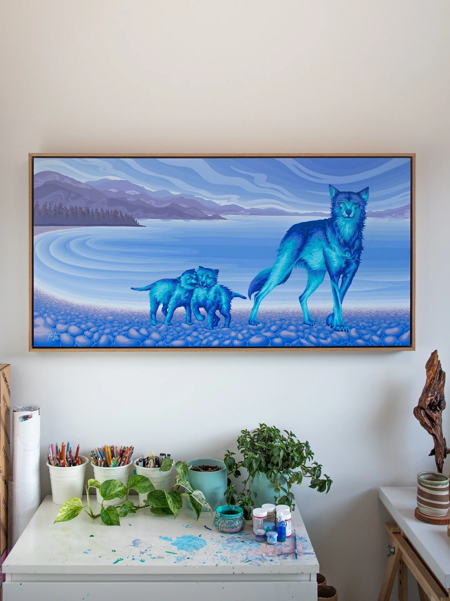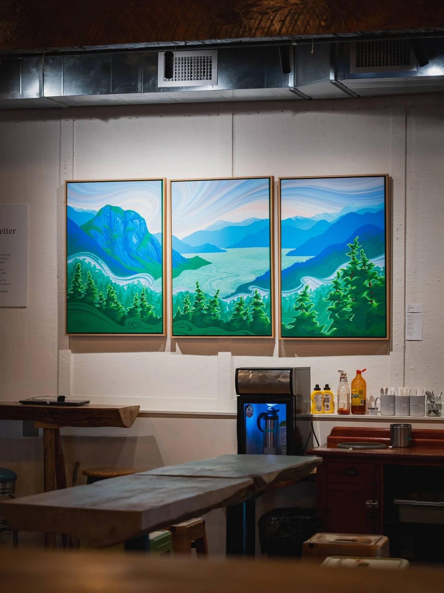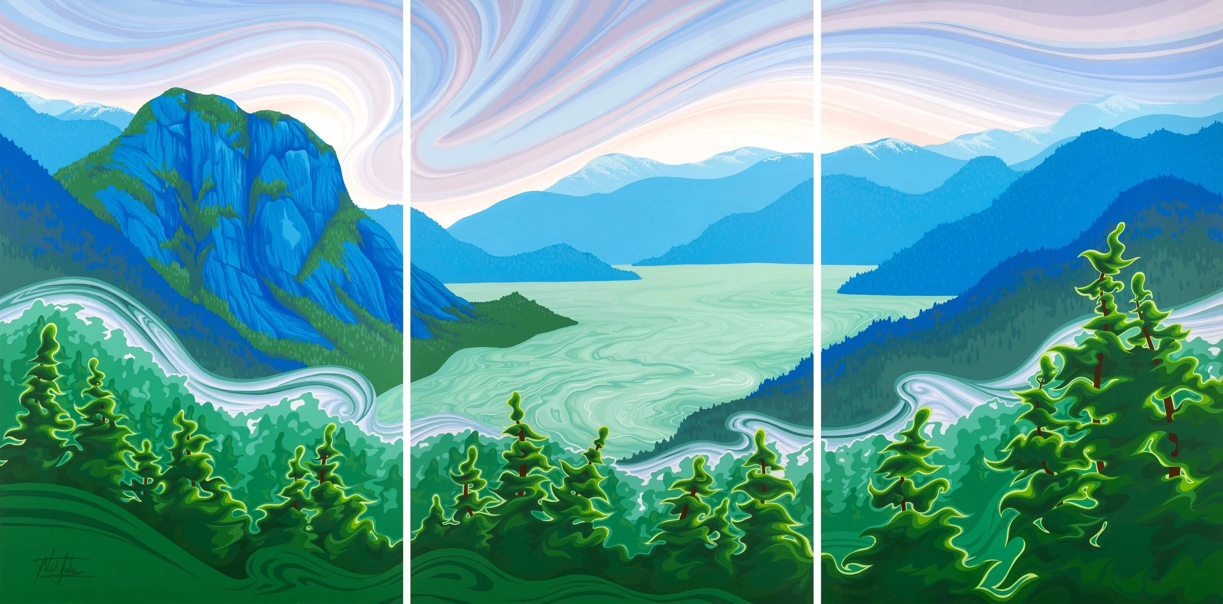 Capturing the essence of Howe Sound on a warm summer’s day, this triptych evokes the calm and vibrancy of the coast. A cloudless sky turns the ocean a luminous turquoise green, framed by blue mountains in every direction. The deep, lush greens of the coastal rainforest hum with life and energy, soaking up every hour of sunlight. Each panel celebrates one of the three elements that make Squamish such a spectacular place: the mountains, the ocean, and the forest.
