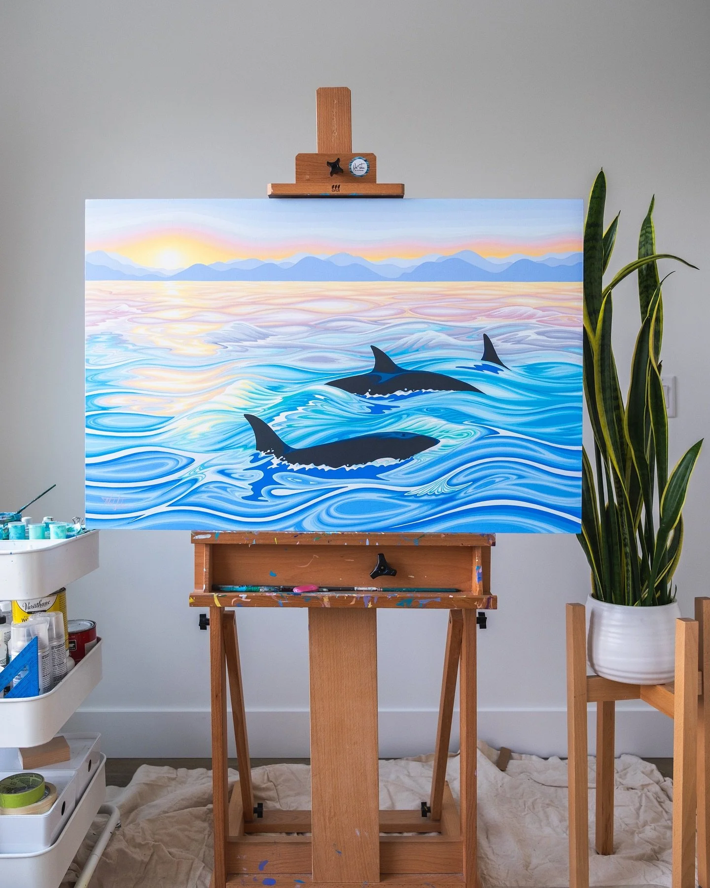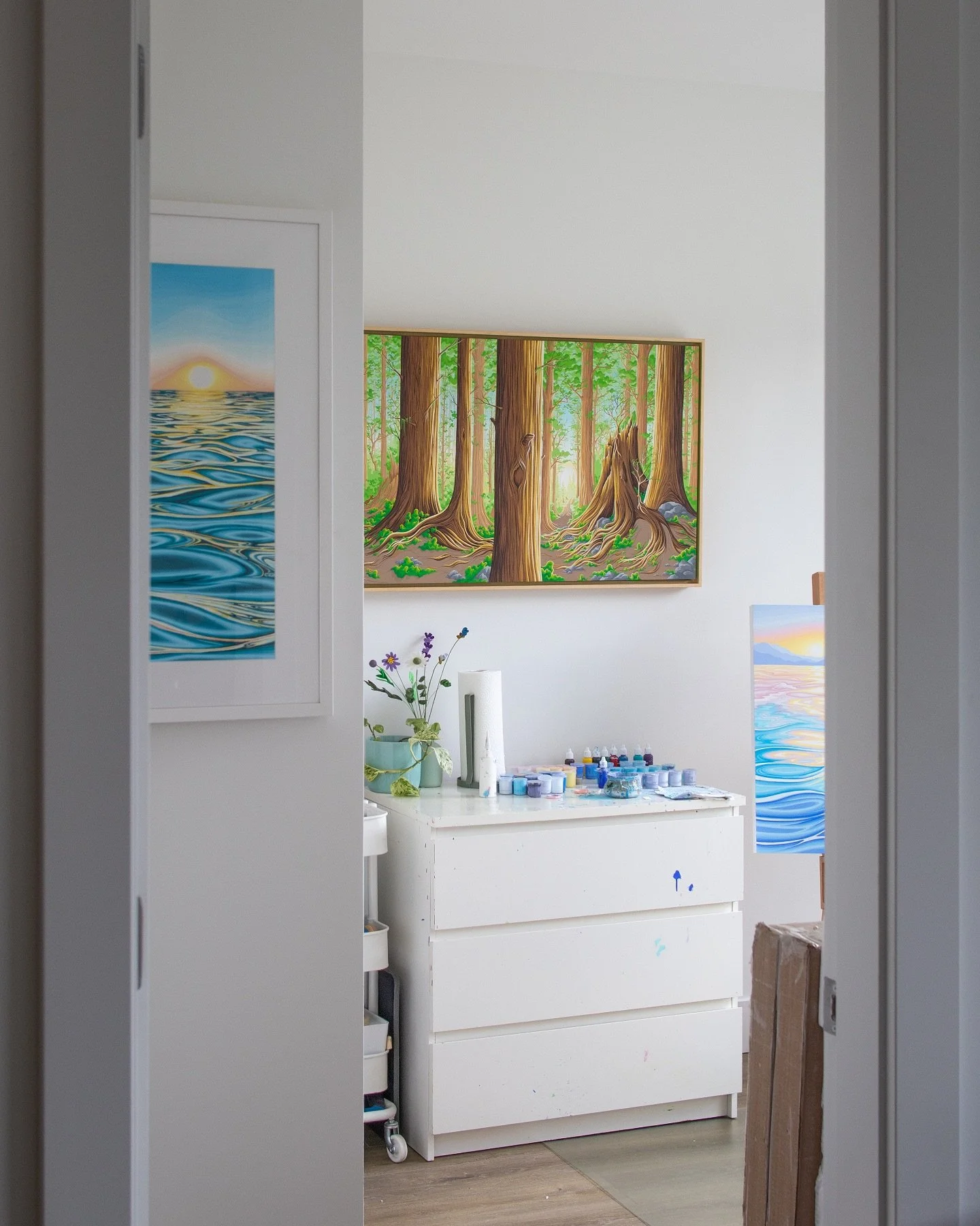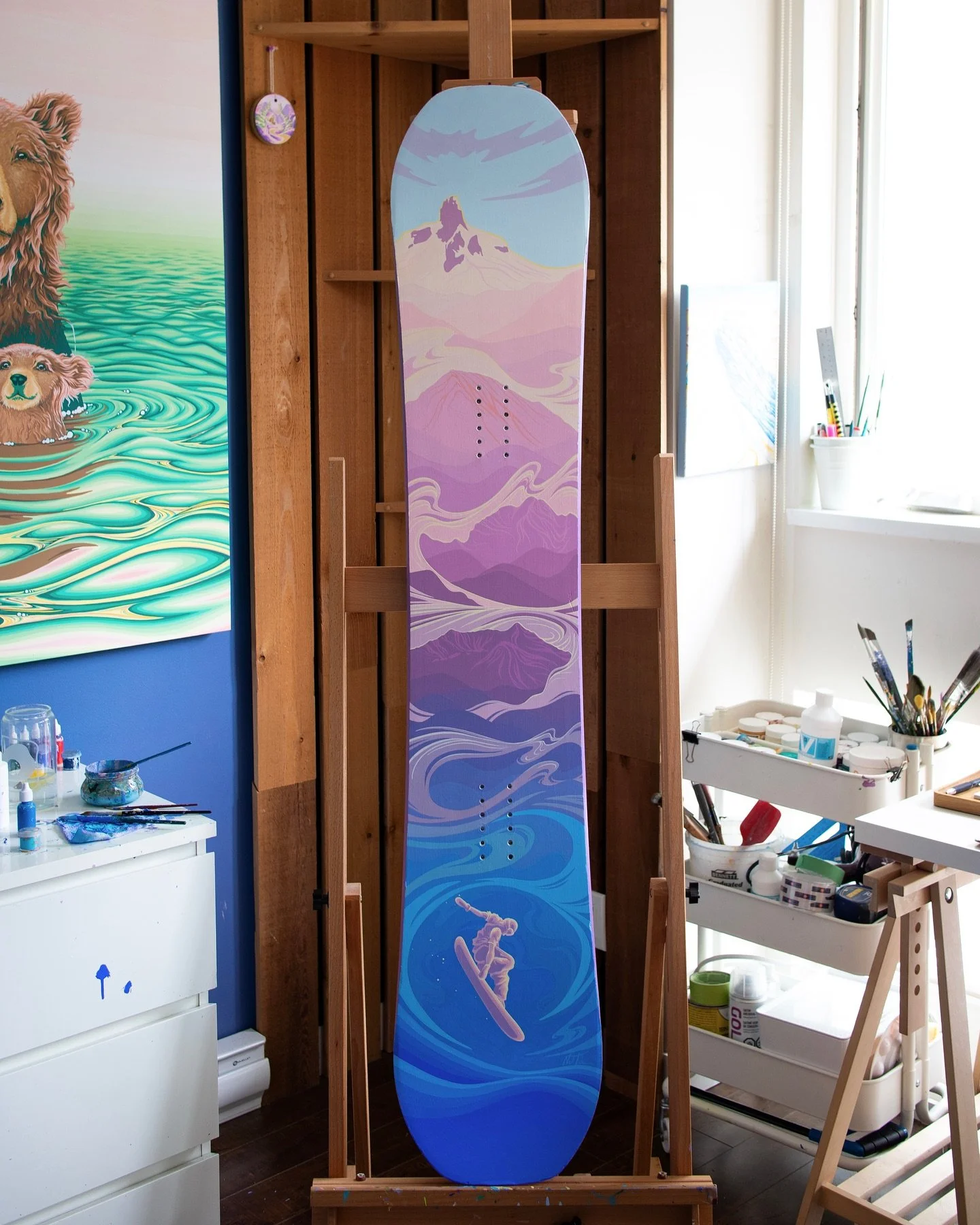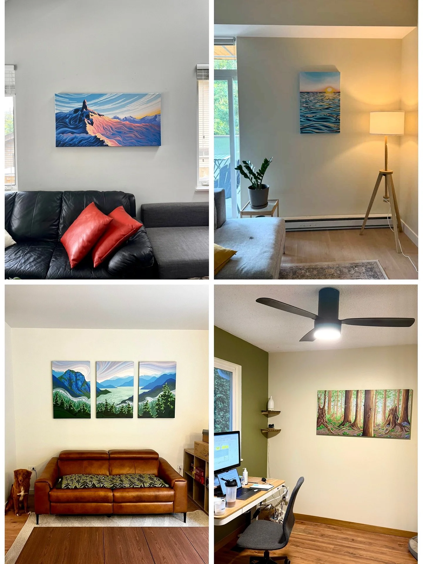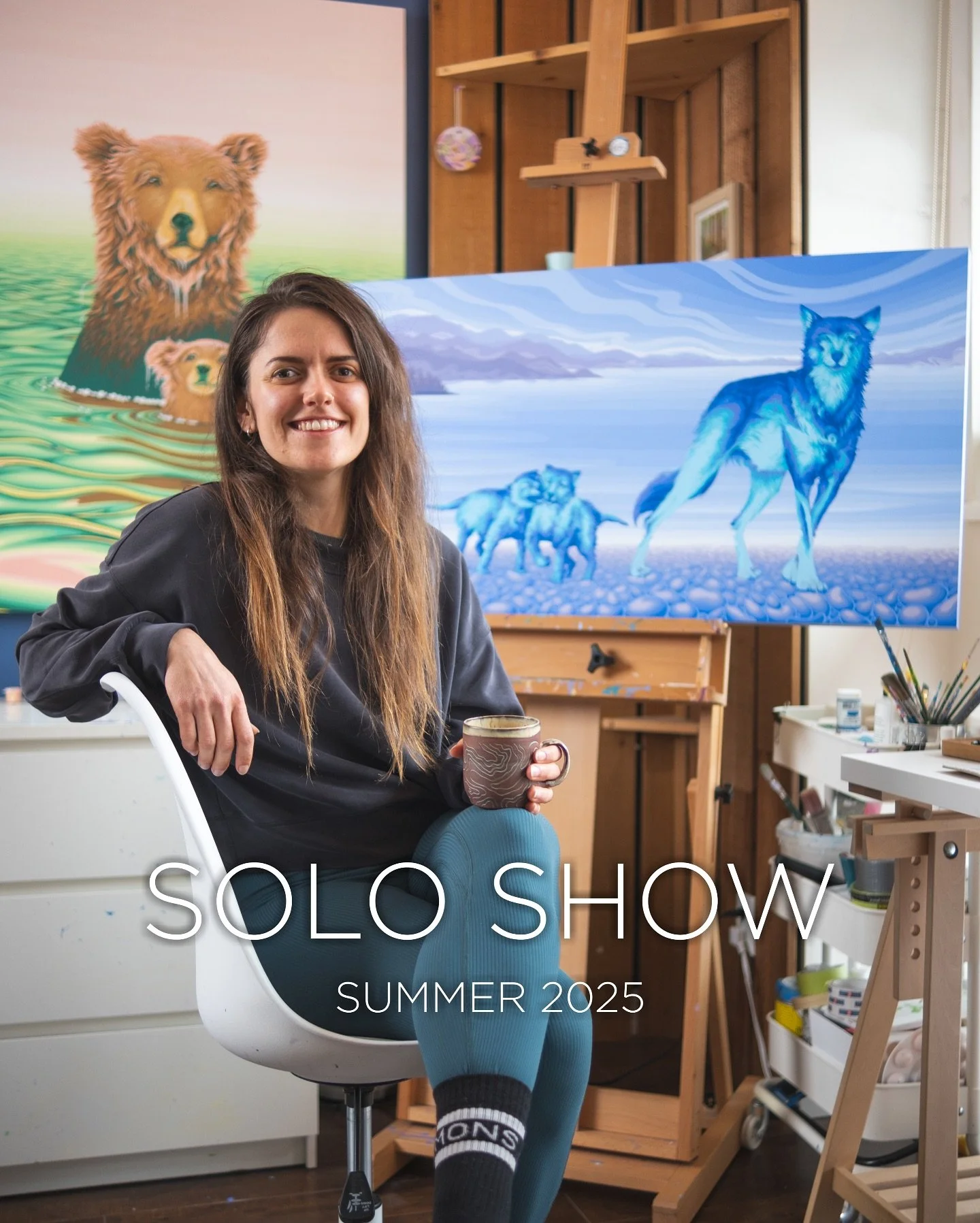 Capturing the essence of Howe Sound on a warm summer’s day, this triptych evokes the calm and vibrancy of the coast. A cloudless sky turns the ocean a luminous turquoise green, framed by blue mountains in every direction. The deep, lush greens of the coastal rainforest hum with life and energy, soaking up every hour of sunlight. Each panel celebrates one of the three elements that make Squamish such a spectacular place: the mountains, the ocean, and the forest.